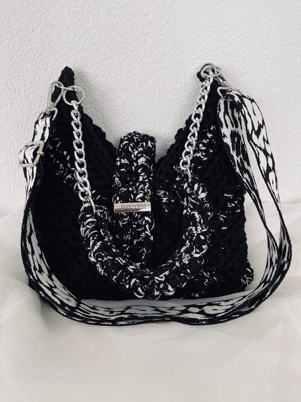 – Une chaîne argentée, lumineuse et raffinée, avec une partie crochetée à la main pour un confort optimal sur l’épaule