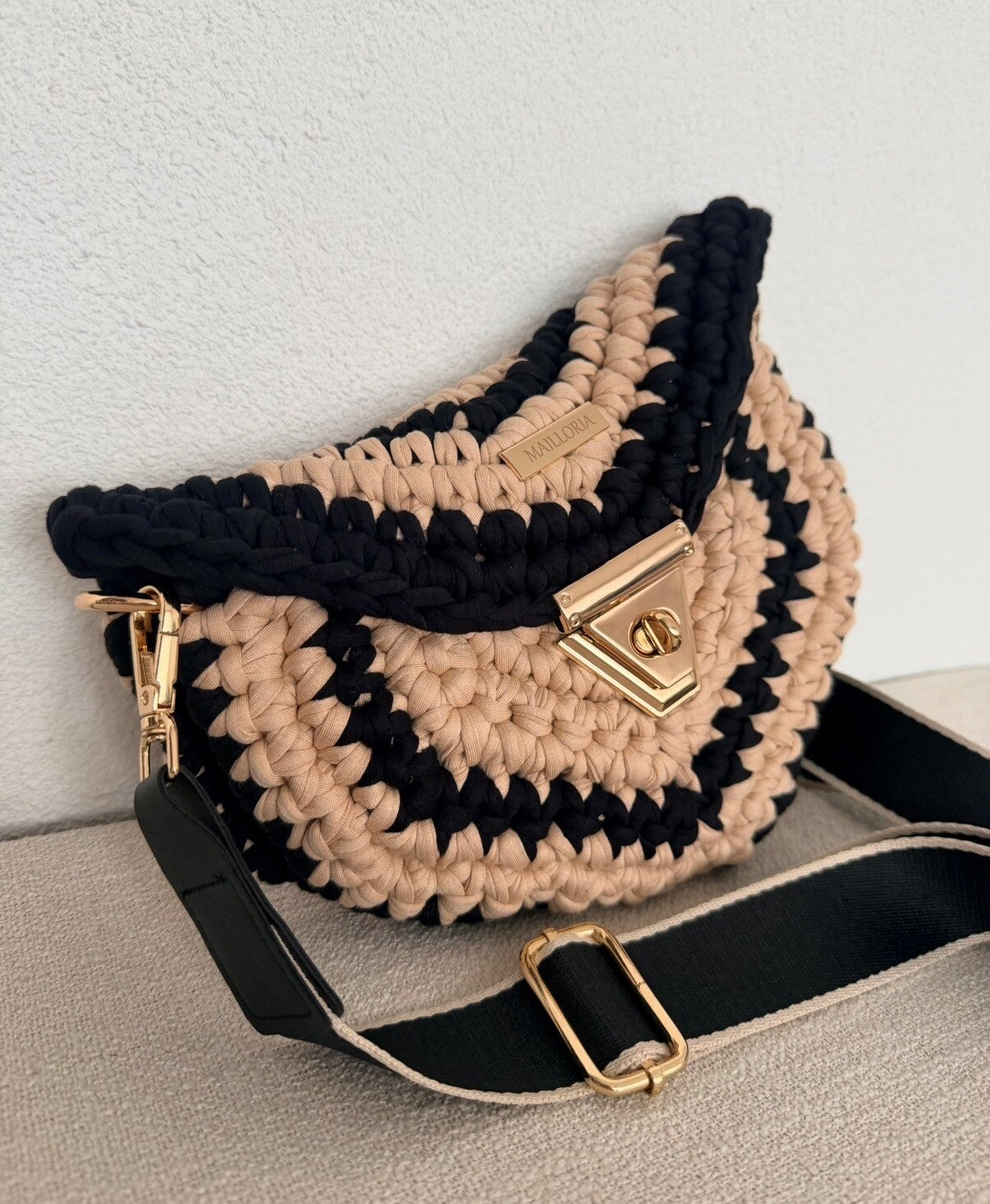 Entièrement crocheté à la main, il révèle un travail minutieux où chaque détail est pensé pour sublimer la matière. Les finitions dorées viennent apporter une touche lumineuse et raffinée, signature d’une pièce élégante.